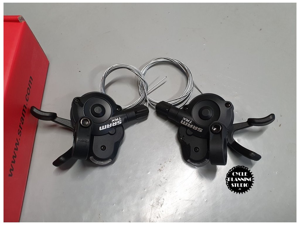 Radiace páčky SRAM TRX. Radenie určené pre osemrýchlostné sady 3 x 8 Actuation ratio kompatibilné so 1:2 SHIMANO. Presné indexové radenie pri všetkých prevodoch s okamžitou odozvou. Uloženie na dvoch ložiskách pre dlhšiu životnosť a indikátor radeného prevodu.
